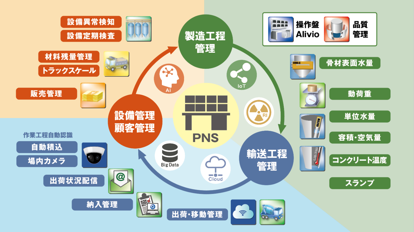 生コンクリート生産に関わる弊社開発システム群(出荷管理、品質管理、販売管理、搬送・帰着管理、電光表示、アジテータ車専用GPS、誤納防止、メール配信、監視カメラ等)と生コンに含まれる「水」を制御するためのセンサー群をネットワークで結び、一元化された情報の下で、生コンを製造する仕組みが<PNS>です。