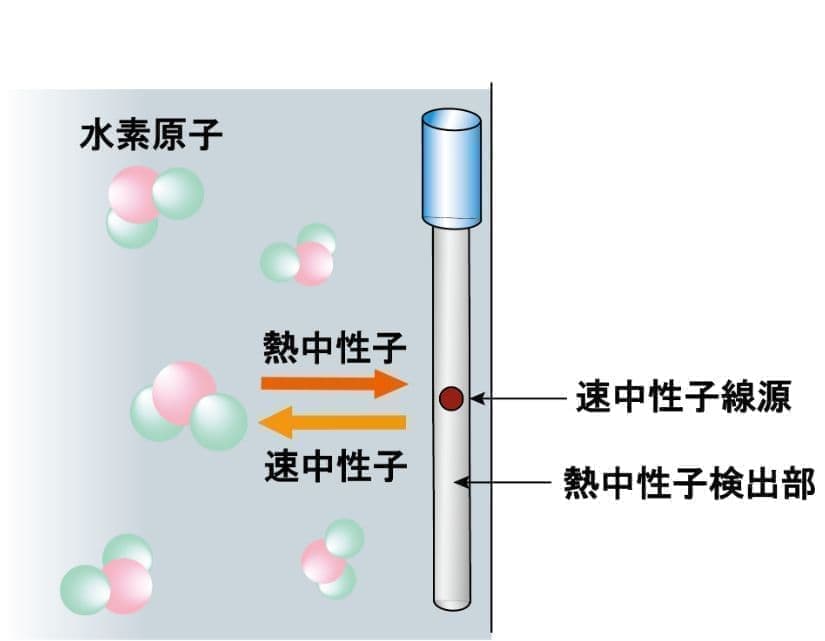 水素原子は他の原子よりも速中性子を熱中性子に変換させる能力が非常に大きい為、物質中に水素原子が多く存在するほど速中性子と衝突を繰り返します。この衝突によって(速中性子から)変換された熱中性子を検出することで、生コンの単位水量を測定します。