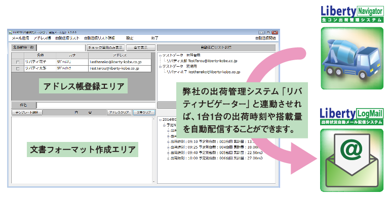 「3台目は何時頃にコチラに着きますか?」「すみません、もう着くと思うのですが…」。そんな電話のやりとりに作業の手を止められたり、工場全体の業務に支障が出たり。しかし現場にとって、どのミキサー車が何時に着くかは、工事の進行を左右する重要な問題だから応えないわけにもいかない…。そんな状況を解決する画期的な仕組み、それが出荷状況自動メール配信システム「リバティ ログメール」です。